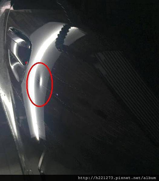 | 汽車凹痕修復前,燈管照。 明顯就是一個超深的鈑金凹痕。 |