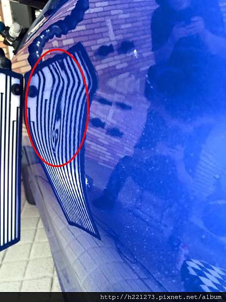 | 汽車凹痕修復前(紅色圈起處),線條亂七八糟。 |